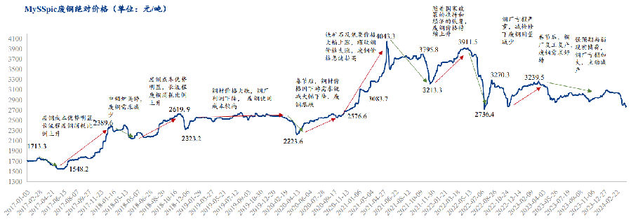 2017年均价1755.8元/吨;2018年2349元/吨;2019年2561.9元/吨;2020年2545.7元/吨;2021年3492.17元/吨;2022年3378.56元/吨;2023年3029.05元/吨。 截止2024年4月7日,MySSpic废钢绝对价格为2780.4元/吨,周环比下跌46.7元/吨,跌幅1.65%,年均价为2980.75元/吨,年同比下跌48.31元/吨,跌幅1.59%。