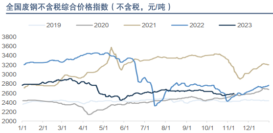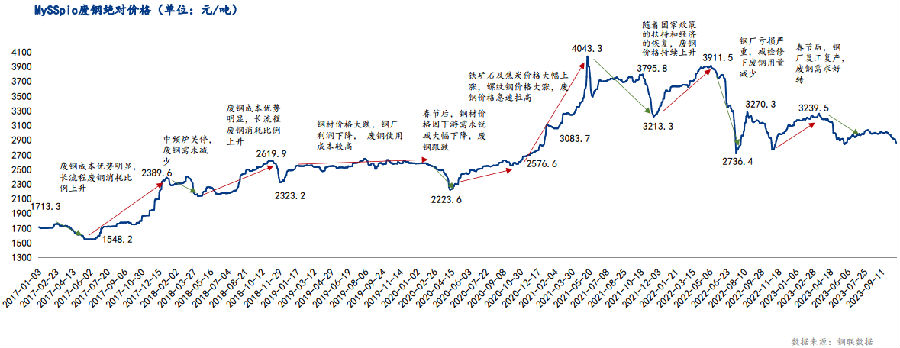 2017年均价1755.8元/吨;2018年2349元/吨;2019年2561.9元/吨;2020年2545.7元/吨;2021年3492.17元/吨;2022年3378.56元/吨。截止2023年10月25日,MySSpic废钢绝对价格为2865.3元/吨,周环比下跌50元/吨,跌幅1.72%,年均价为3048.25元/吨,年同比下降330.32元/吨,跌幅9.78%。